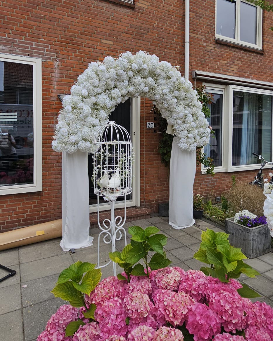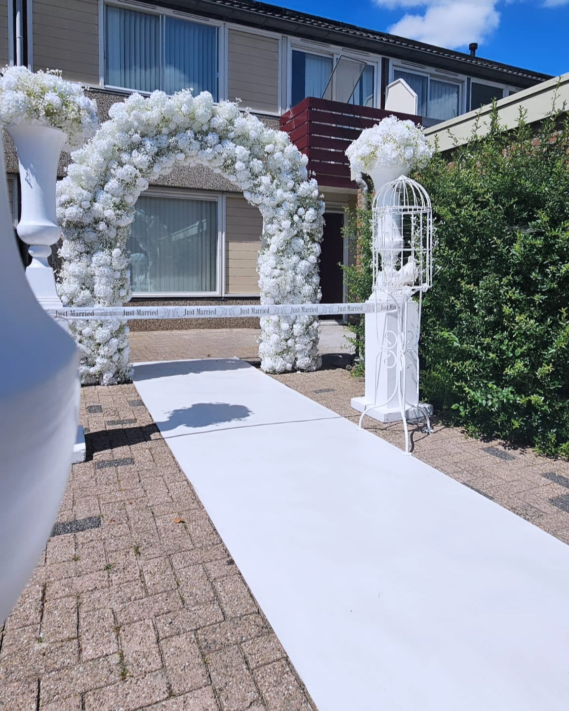 Onze prachtige gipskruidbogen zijn ideaal voor bruiloften, verlovingen en andere feestelijke gelegenheden. Je kunt kiezen tussen een volle boog of een halve boog, beide met stijlvolle toevoegingen zoals pilaren en een witte loper.